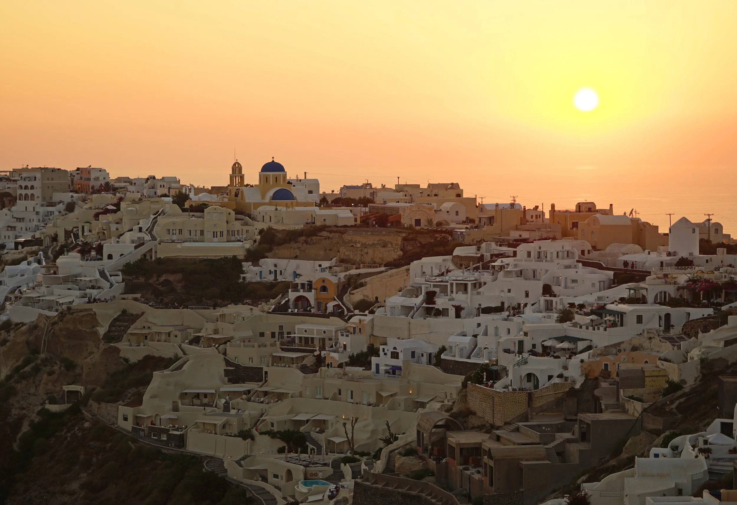 Fira is the capital city in Santorini, located in the west coast of the island. Apart from the museums, galleries, and cultural events, Fira also has the largest shopping center, restaurants and entertainment in Santorini. Imerovigli is located in between Fira and Oia, it doesn't have busy shopping centers or late night entertainment, but it is known for the tranquility and beautiful resorts. Oia is located on the north west edge of Santorini, it is known as the most romantic and most photographed city in Greece. The most iconic blue dome white stone churches attract tourists and photographers from all over the world. Although beautiful sunset can be seen all around Santorini island, Oia is famous for the best location for sunset all around Santorini, overlooking the the volcano and Aegean Sea.